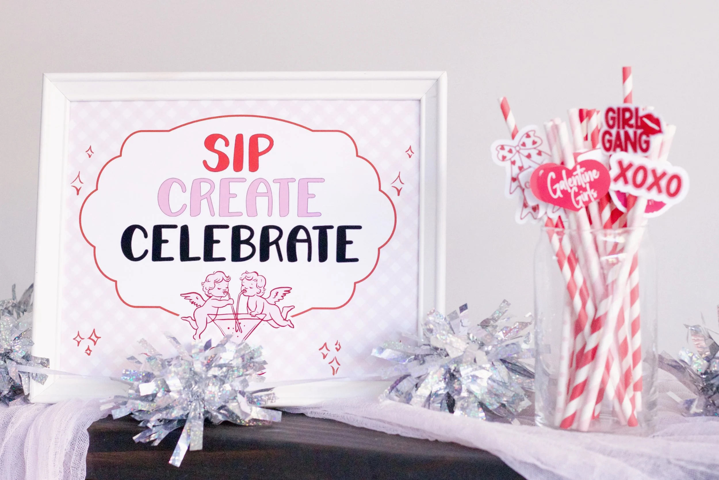 One of my favorite details from the night had to be these custom drink toppers I made using my Cricut machine. I designed each one to match the Galentine’s theme and added them to the drink station with striped paper straws, and they ended up being the cutest little touch.